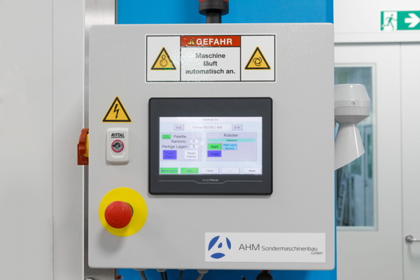 Auf der Suche nach einer geeigneten Lösung stand zunächst ein klassischer Palettierer mit zwei Linearachsen im Fokus. Deshalb wendeten sich die Verantwortlichen an die AHM Sondermaschinenbau GmbH in Dasing bei Augsburg, die seit über 25 Jahren entsprechende Pack- und Palettiersysteme entwickelt und realisiert.