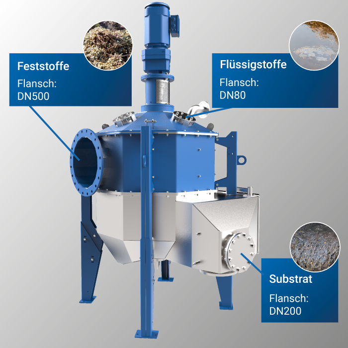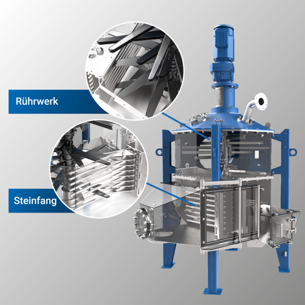 Organische Substrate mit einem Trockenanteil von bis zu 18 Prozent passieren den BIO-ROXX mit einer Geschwindigkeit von mehr als 85m3/h. Dank der Verweilzeit im Modul können Fremdkörper auf den Boden der Mischkammer sinken, wo sie in einem Steinfang gesammelt und sicher ausgetragen werden. Dadurch gelangen keine Festkörper in den Fermenter. Das Leeren der Gärbehälter zu Wartungs- und Reparaturzwecken entfällt.